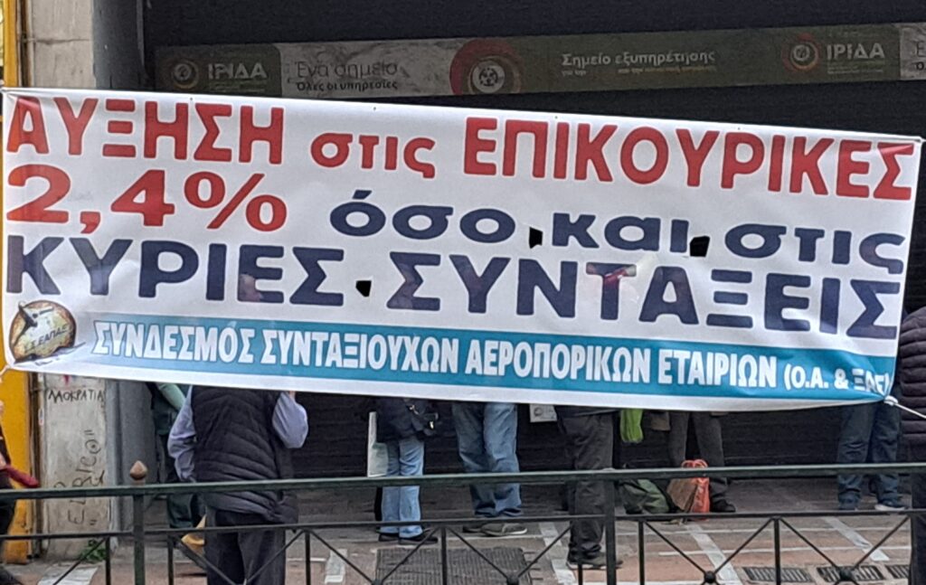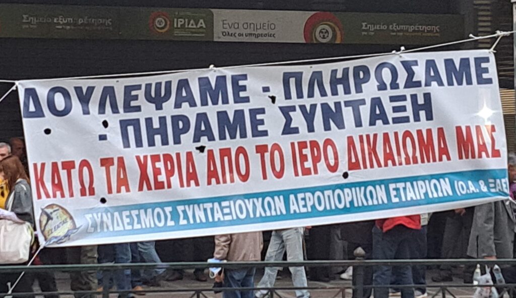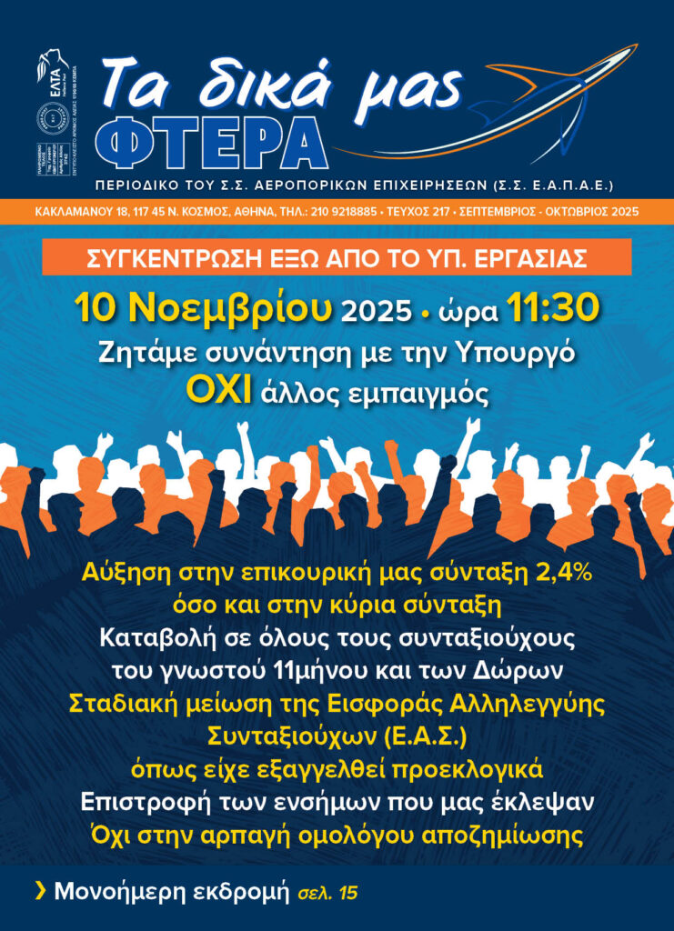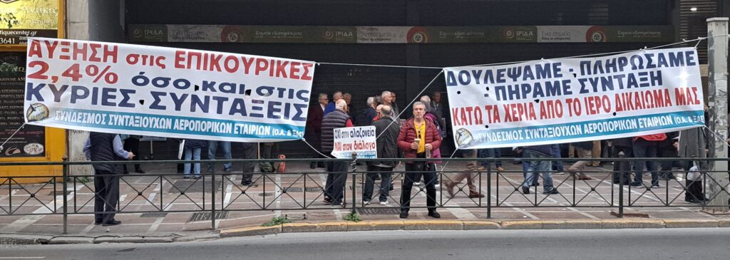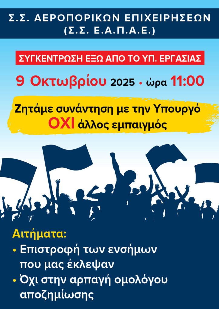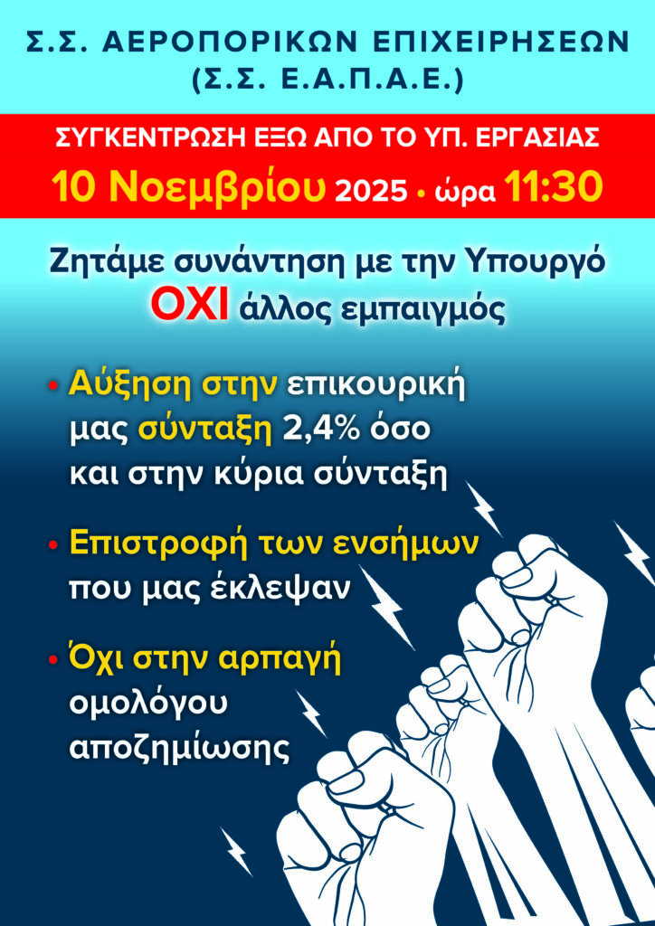 Στις 9/10/2025 πραγματοποιήθηκε η δυναμική κινητοποίηση-διαδήλωση διαμαρτυρίας που συναποφάσισαν ο Σύνδεσμος Συνταξιούχων Αεροπορικών Εταιριών (ΣΣ ΕΑΠΑΕ)  και ο Σύλλογος Συνταξιούχων Εμπορικής Τράπεζας, έξω από Υπουργείο Εργασίας για να συναντήσουμε την υπουργό ώστε να θέσουμε τα θέματα που απασχολούν τους συλλόγους μας, για να δοθούν λύσεις.